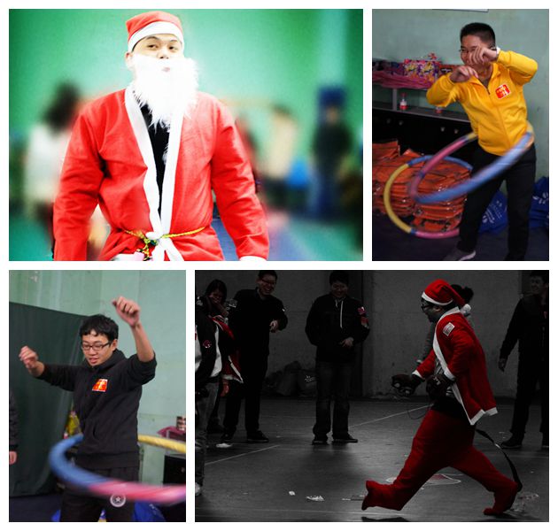 男生也會轉呼啦圈?男生還會踢花式毽子?哈哈,今天就讓大家大飽眼福啦!最威猛的圣誕老人接力賽要開始啦――跳繩50下、踢毽子10下、呼啦圈20圈、2位圣誕老人穿戴整齊來回運輸乒乓球!